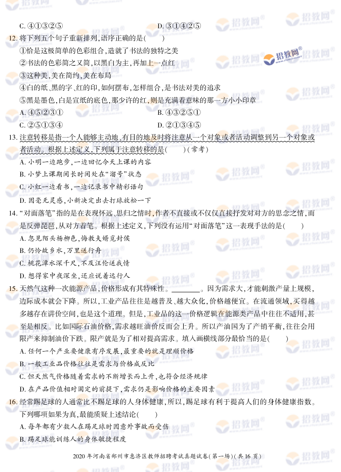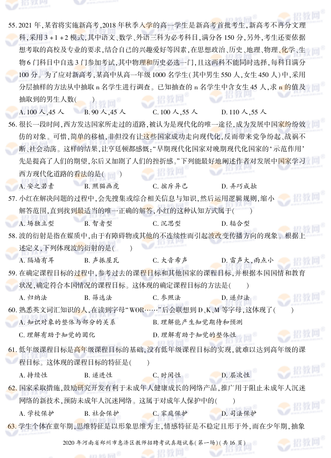 2020年河南省郑州市惠济区教师招聘考试试题试卷及答案解析