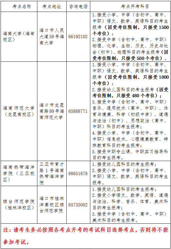 (三)考生在网上报名时,请务必根据考点开考科目选择考点,否则将不能参加考试,由此造成的后果由考生本人负责。