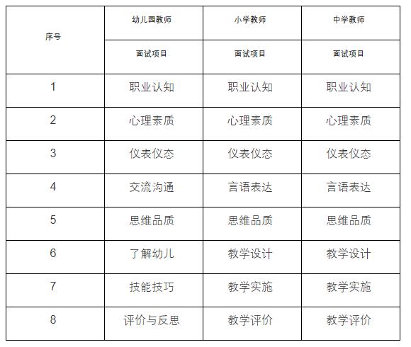各学段教师资格考试面试项目具体如下(中职教师面试项目同中学教师):