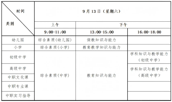 答:全国统一考试日期2025年9月13日,各类别考试科目与时间安排如下:
