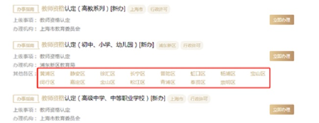 图示3:初中、小学、幼儿园请先选择受理区后在跳转页面点击【立即办理】;高级中学、中等职业学校直接点击【立即办理】