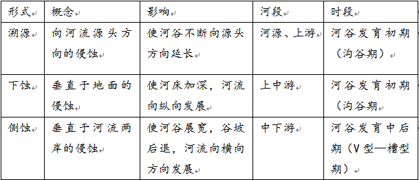 1.了解流水侵蚀地貌的形成,能够用表格的形式分析流水侵蚀作用的三种形式及其对地表形态的影响。