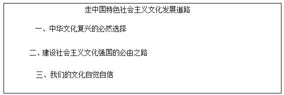 表现:这种文化自觉和自信,表现为对中华文化发展前途充满信心、对中国特色社会主义文化发展道路充满信心、对社会主义文化强国目标充满信心。